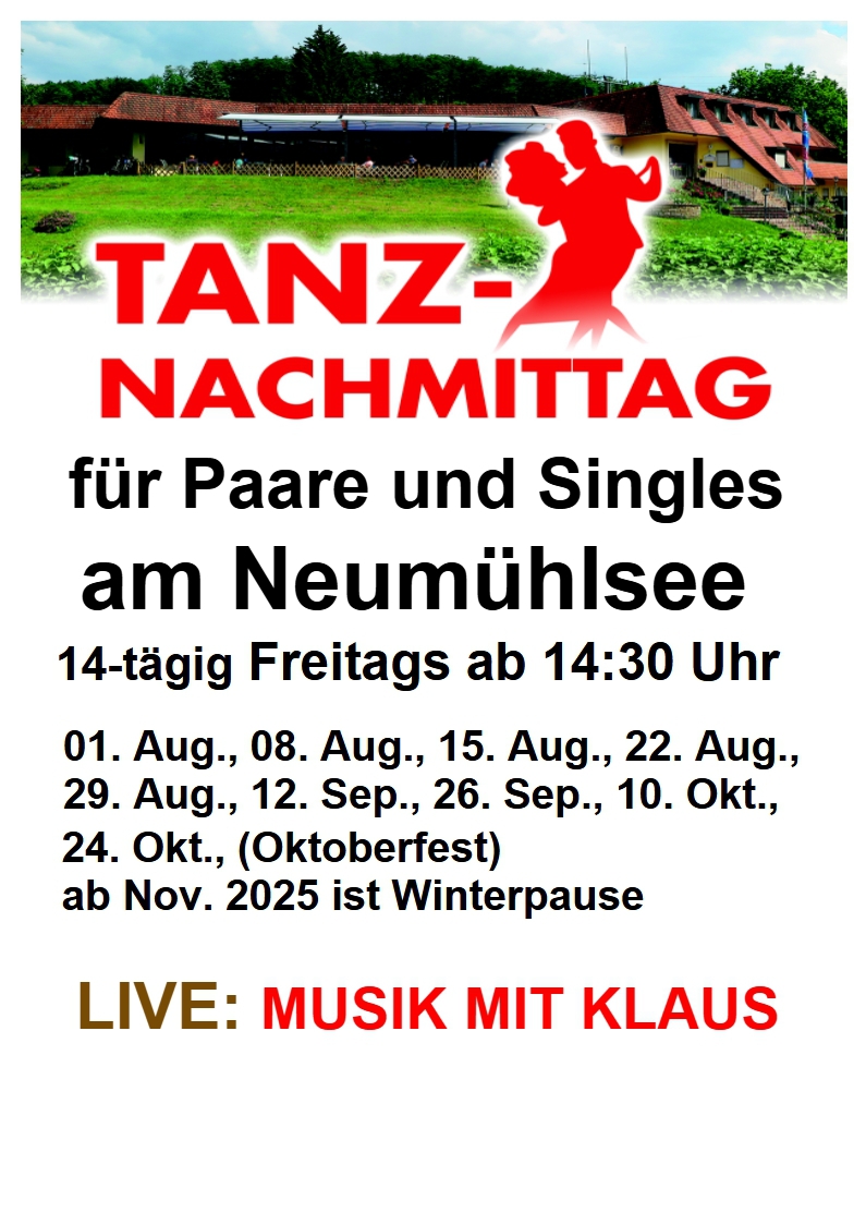 Jeden 2. Freitag von 14.30 bis 18.00 Uhr laden wir Sie herzlich zu unserem Tanznachmittag mit Klaus Baumann ein, Termine bis Oktober 2025 siehe Flyer. Genießen Sie bei Kaffee und Kuchen die wunderbare Musik und lassen Sie sich zum Tanzen verführen. Der Nachmittag steht ganz im Zeichen der Geselligkeit und des Miteinanders. Wir freuen uns auf Ihren Besuch!